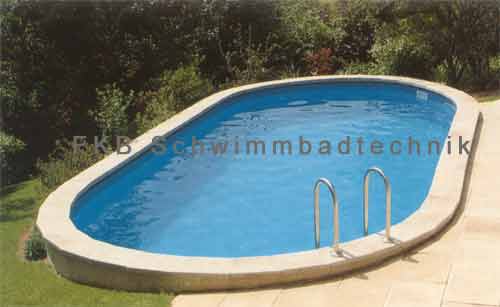 Dieses Becken wird in die Erde eingebaut. Vorzugsweise wird der Beckenboden betoniert und die beiden seitlichen Längsstützwände aus Beton mit Schalsteinen erstellt. Ein beschichteter und verzinkter Stahlmantel gibt dem Becken die ovale Form. Der Stahlmantel wird am Boden in die Bodenschiene gestellt. An der Oberseite fixiert der Handlauf die blaue Einhängefolie.