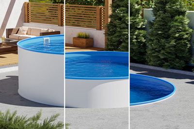 Die Beckenwand besteht aus einem hochwertigen, feuerverzinkten Stahlmantel, außen mit weißem Kunststoff beschichtet und innen mit Schutzlack versehen. An den Enden wird die Stahlwand mittels Aluminium-Steckprofil verbunden, wodurch eine stabile und einfach lösbare Verbindung entsteht.