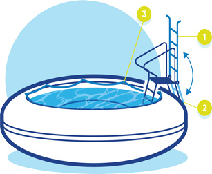 Ein Zodiac Original™ Pool ist ohne Metallstruktur und frei von scharfen Kanten. Seine abgerundeten Formen und der glatte, massive und breite wassergefüllte Wulst schützen Kinder vor Verletzungen. Der Aufblasanschluss mit Deckel bietet weiteren Schutz. Größe und Tiefe des Pools sind ideal, um Schwimmen zu lernen. Die Leiter (1) (2), die Bestandteil all unserer Bausätze ist, sowie das Tau (3) am Beckenrand sorgen dafür, dass Zugang und Benutzung auch für kleine Kinder sicher sind.