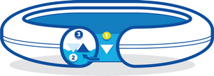 Das Wasser im Becken erzeugt einen mit der Tiefe zunehmenden Druck (1). Das Wasser zirkuliert durch Öffnungen an der Unterseite der Wasserwulst (2) vom Becken zum Wulst. Der Wasserdruck wird dadurch auf die im Wulst (3) eingeschlossene Luft ausgeübt. Dadurch wird die Stabilität des Pools dauerhaft sichergestellt.