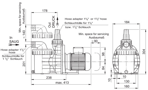 Korrosionsbeständig gegen Schwimmbadwasser und den zugeführten Chemikalien, schnelles Selbstansaugen gewährleistet eine problemlose Inbetriebnahme der Filteranlage und gutes Bodensaugen. Aufstellbar max. 1,5 m oberhalb oder max. 3 m unterhalb des Wasserspiegels.