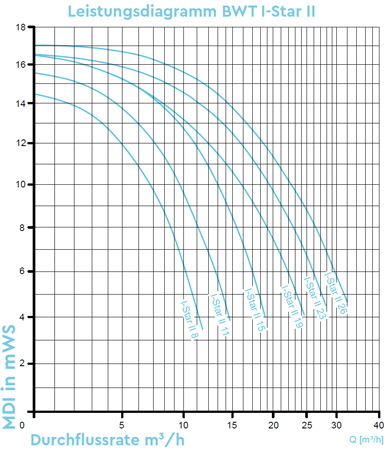 | BWT i-Star II 11 | 11 m³/h | 230 V | 0,69 kW | 0,45 kW | d= 63 mm / 1 1/2" | d= 63 mm / 1 1/2" |