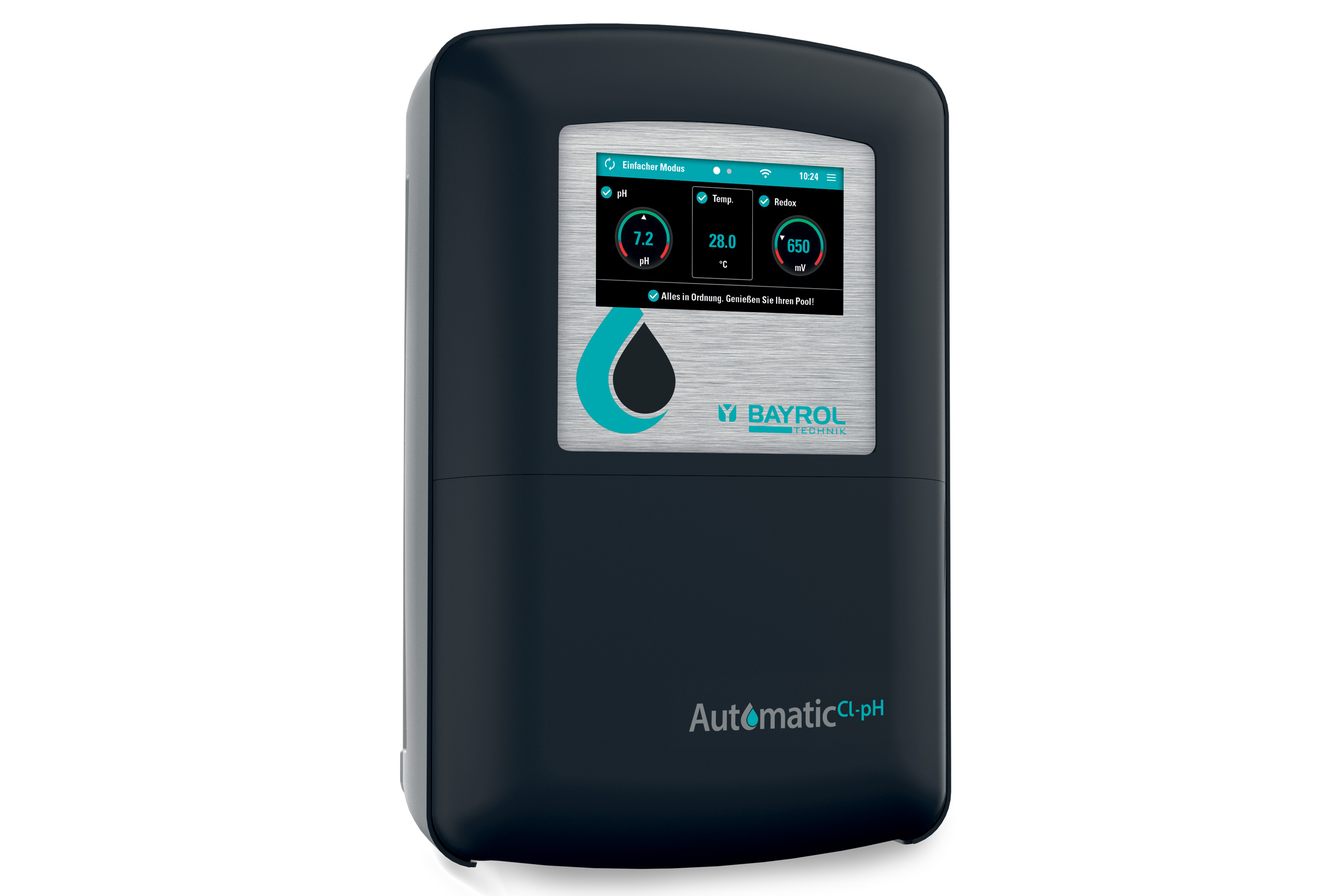 Der große Touchscreen ermöglicht eine komfortable Bedienung und stellt dabei alle wichtigen Informationen übersichtlich dar. Die optimierte Benutzeroberfläche ermöglicht Ihnen zudem eine schnelle und selbsterklärende Inbetriebnahme. Das integrierte WiFi-Modul des Automatic Cl-pH ermöglicht eine bequeme Bedienung des Gerätes über die neu entwickelte Mobil-APP oder das BAYROL-Web-Portal.