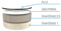 Das Patent für die Acrylplatte Lucite ABS-PMMA ermöglicht es, die Beständigkeit von Acryl mit der Festigkeit von ABS zu verbinden, verstärkt durch 2 Schichten hochdichter Sirtek-Isolierung.